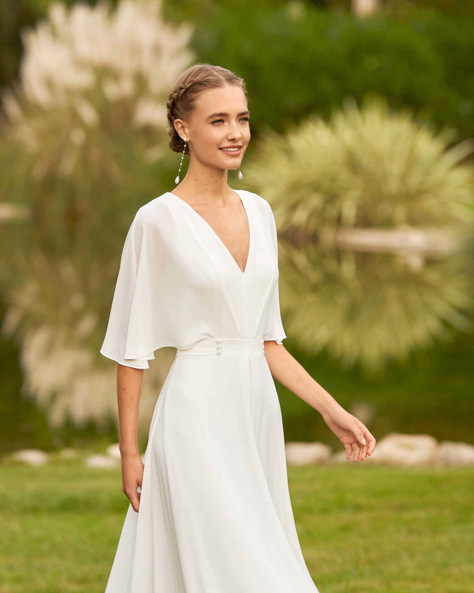 Elegante trouwjurk in kokerstijl met een vloeiende overrok; met een V-hals, een druppelvormige achterkant met parelknoopdetail en vloeiende mouwen. Exclusief Alma Novia-ontwerp gemaakt van crespon.