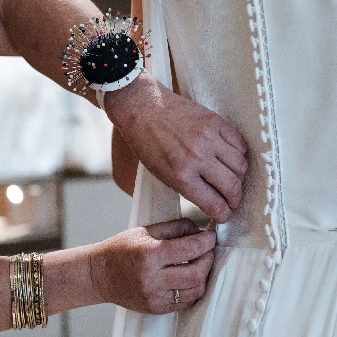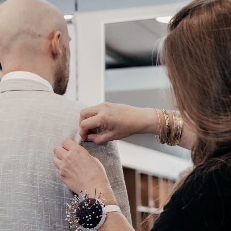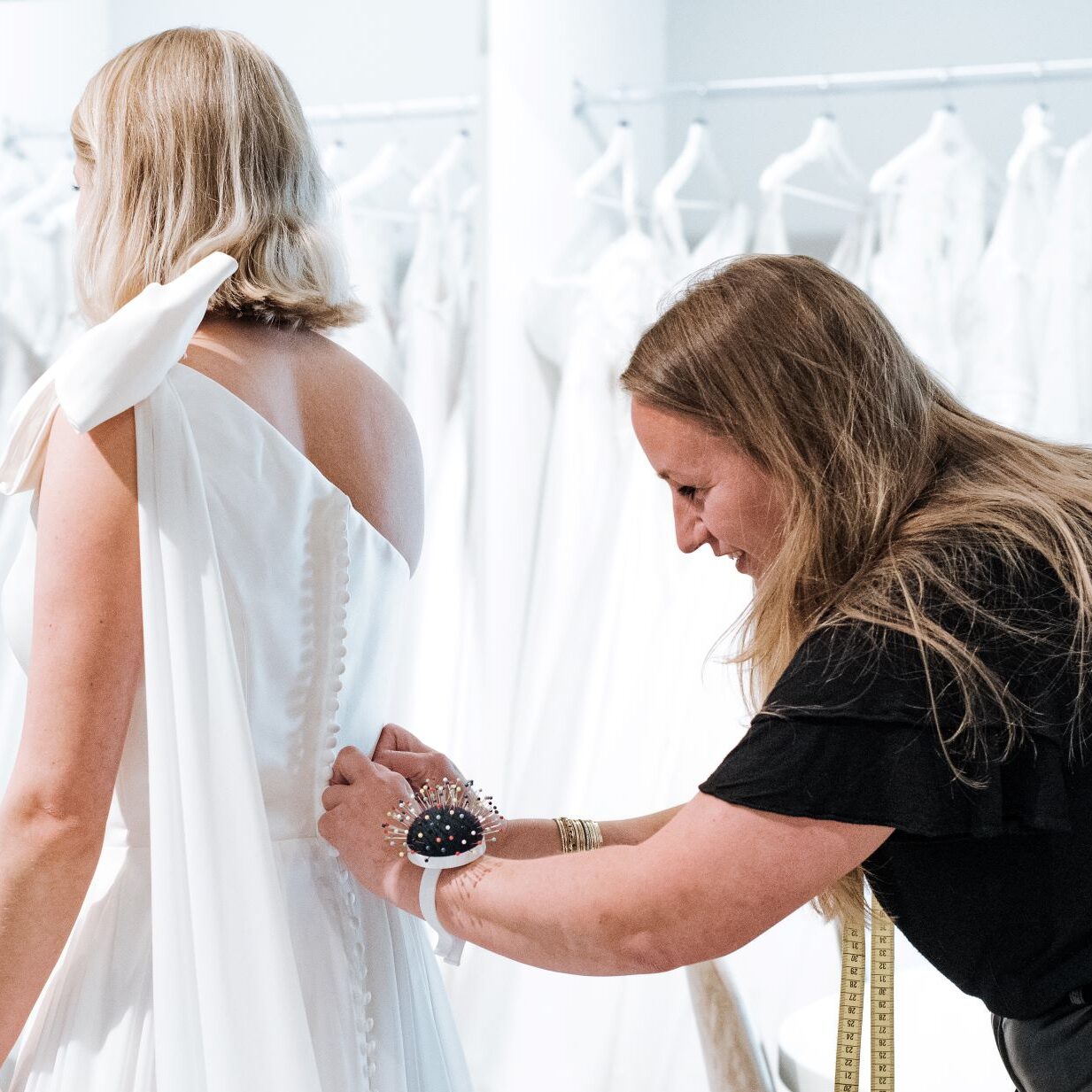 De stylistes zullen jou tijdens de afspraak begeleiden, zij weten precies hoe het product eruit moet komen te zien op jouw lichaam. Ook kunnen de stylistes je helpen met het uitzoeken van accessoires. Wanneer het technische deel van de afspraak begint zal een van onze coupeuses komen om je trouwjurk of trouwpak op maat te komen spelden. Elk lichaam is anders waardoor het spelden en vermaken van een trouwjurk of trouwpak echt maat werk is.