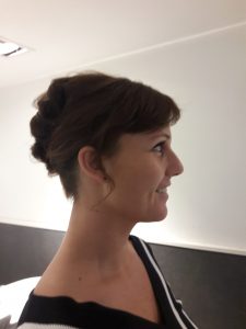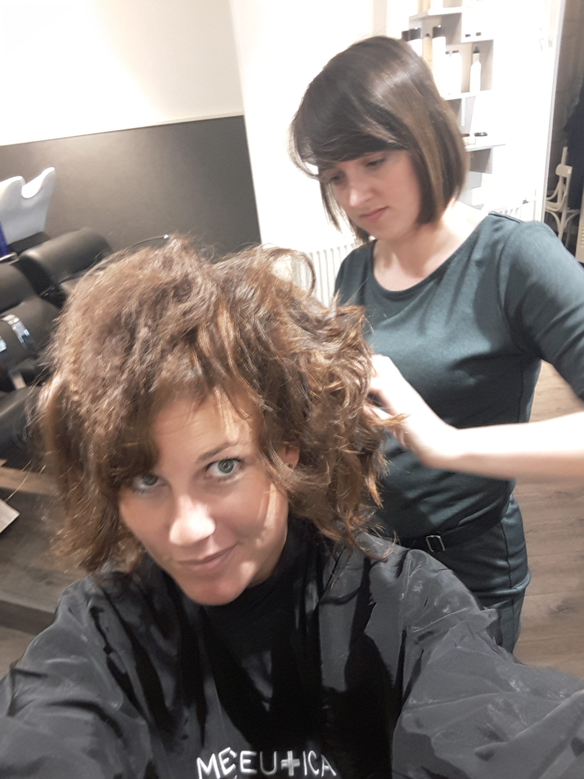 Terwijl ik lekker aan een kopje thee zat en met haar collega’s zat te kletsen ging Joyce aan de slag. Er kwamen eerst een krultang en een föhn bij kijken. Daarna een wafeltang en heel, heel veel speldjes. Er werd van alles ingespoten maar ook weer van alles uitgekamd. Joyce legde me uit dat we op die manier het Roy-Donders-effect tegen gingen… aha!