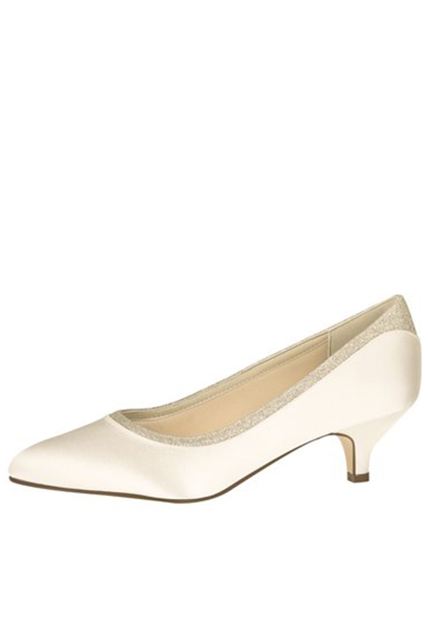Lage pump, 5 cm , in ivoor satijn met zilver glitterrandje