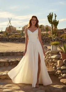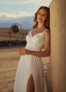 Maak kennis met Channa van Herve Paris. Deze trouwjurk heeft een nette v-hals en een spaghettibandje. De rok valt heel soepel en zwierig, met de split als kleine knipoog. De top is versierd met botanische applicaties die bedekt zijn met pailletten. De kanten lijnen op de top lopen in een puntje naar de taille.