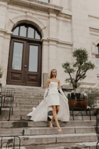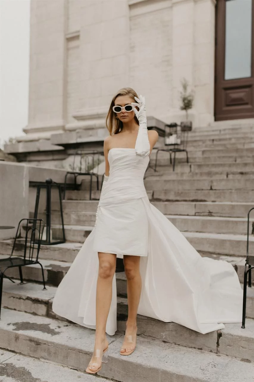 Een complete glamoureuze look van taft! De Libra korte trouwjurk heeft een bustiervorm met draperieën aan de bovenkant. Maak dit veelzijdige ontwerp af met de afneembare taft-overskirt. Twee looks in één jurk!
