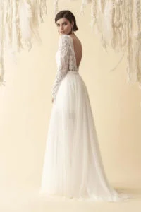 Voor de bruid die eruit wil springen. Deze elegante maar speelse playsuit is geheel van kant en heeft lange mouwen. De playsuit is alleen verkrijgbaar maar kan ook perfect gecombineerd worden met een losse overrok met een gave split in het tule. Een echte eyecatcher. Prijs indicatie is gebaseerd op de playsuit en rok samen.