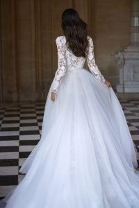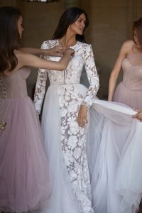 Blair is een práchtige trouwjurk van Milla Nova. Ze heeft een slank vallend silhouet en spaghettibandjes met plunge halslijn. Ze is bedekt met mat 3D-kant. Milla Nova heeft bij deze bruidsjurk een bijpassend jasje met tule cape ontworpen. Supergaaf om erbij aan te trekken! Eventueel tijdens de ceremonie en dan doe je de cape ’s avonds uit, dan heb je twee verschillende looks.