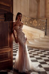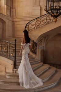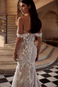 Betoverende strakke trouwjurk, vervaardigd uit luxe chantilly kant en is sierlijk versierd met 3D-bloemenapplicaties. Met een sweetheart decolleté en een V-uitsnede daaronder, biedt deze jurk ingebouwde cups in een gestructureerd korset met baleinen. De off-the-shoulder mouwen zijn versierd met 3D-bloemen en semi-transparante inzetten in het lijfje accentueren de rondingen. Een ritssluiting aan de achterkant zorgt voor een perfecte pasvorm. De nauwsluitende rok loopt gracieus uit in een delicate sleep, wat het geheel compleet maakt.