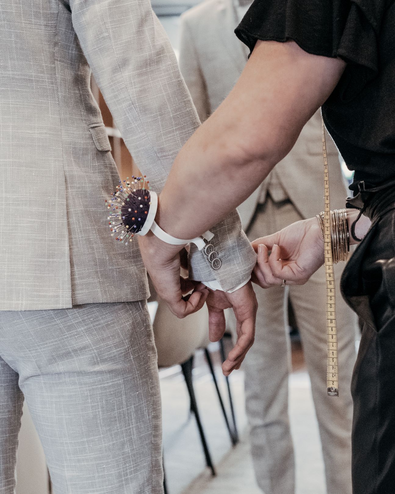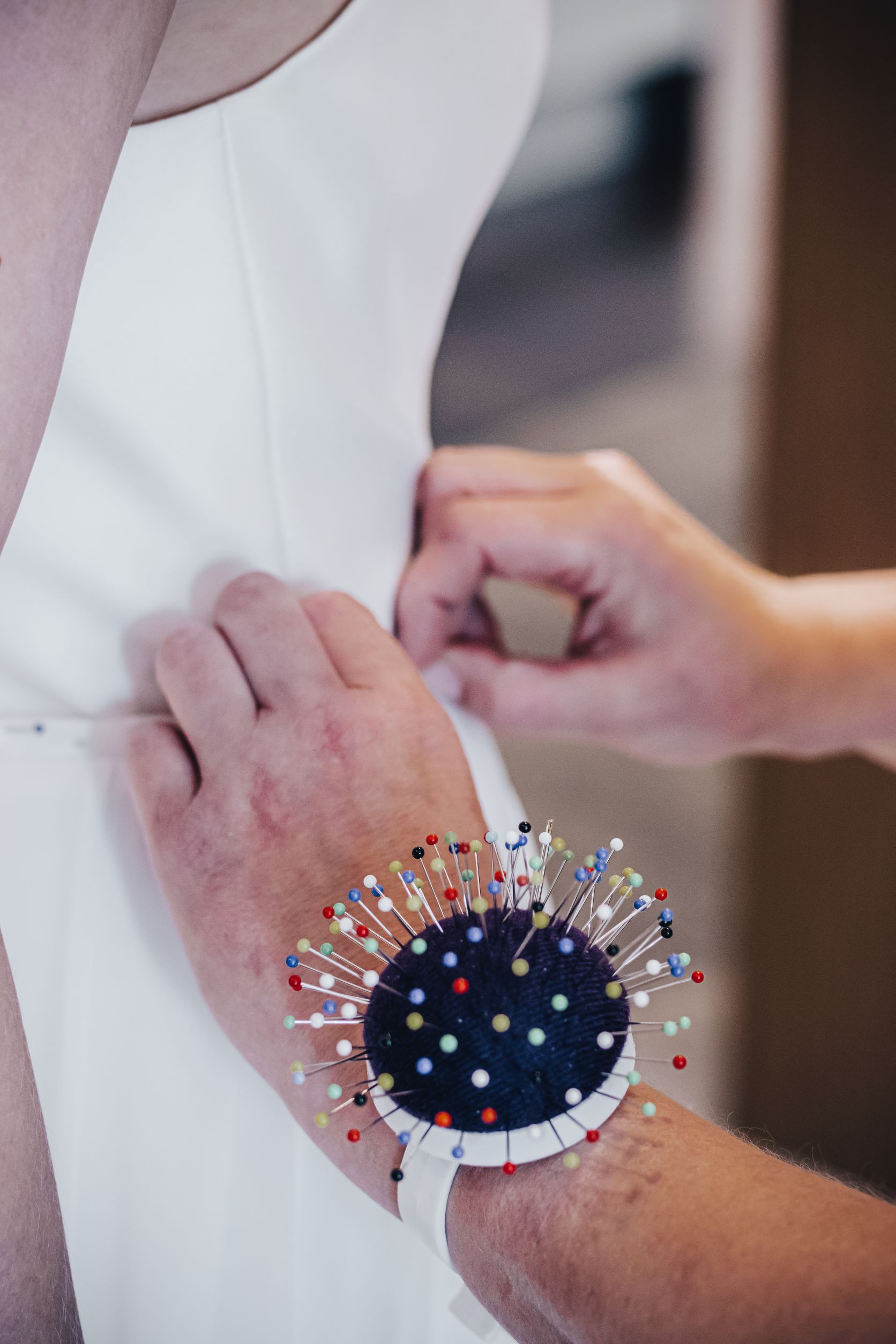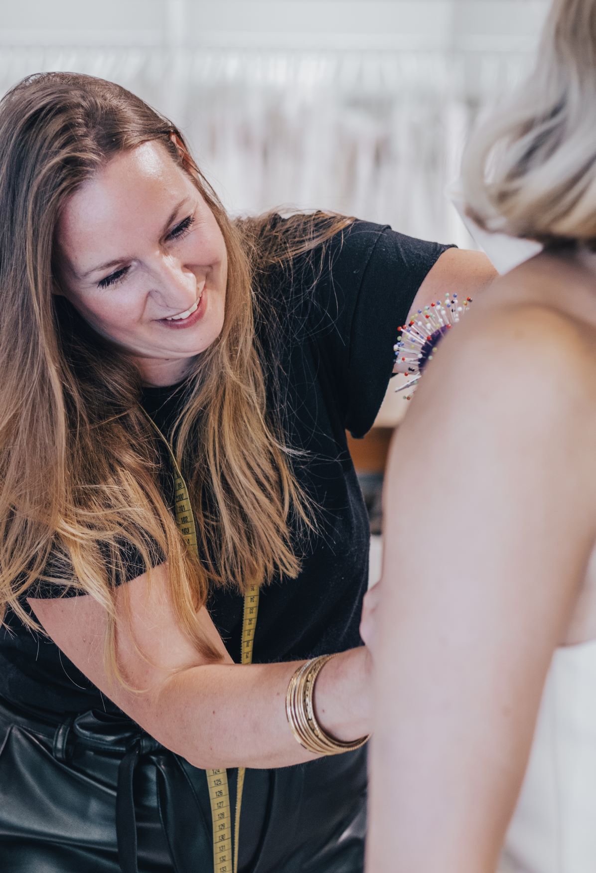 Wanneer de trouwjurk binnen is kunnen wij gaan beginnen met de eerste pas. De trouwjurk wordt aangetrokken en dan kunnen we gaan kijken waar hij vermaakt moet worden. De collega speld de trouwjurk op je lichaam en de coupeuse wordt er bij geroepen. Wij hebben een eigen bruidsatelier aan huis, onze 18 coupeuses werken hard aan de trouwjurken om ze perfect op maat te maken. Het passen gebeurt op doordeweekse dagen, dit omdat er in het weekend geen coupeuses in huis zijn. Mocht het nodig zijn vallen wij graag terug op onze vertrouwde coupeuses.