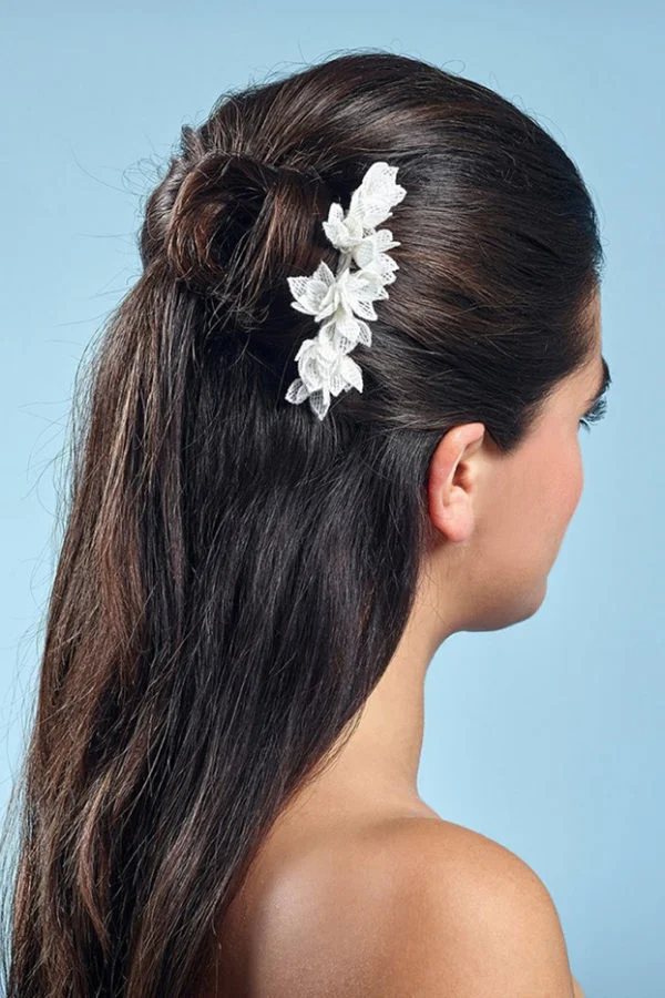 Mooie schuifspeld met tule bloemen voor een subtiele bridal look.