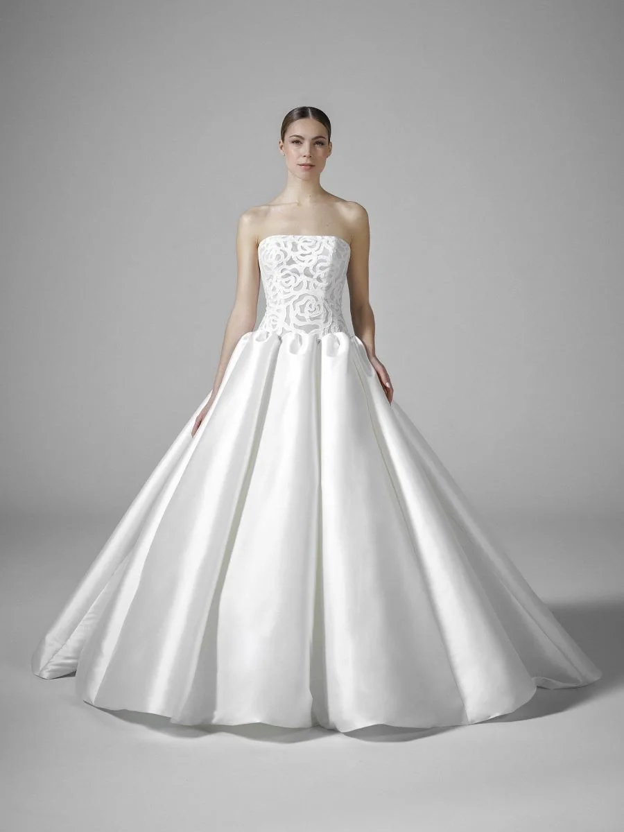 Deze prachtige jurk is er in verschillende stoffen. Wij hebben de jurk in volledig Mikado in de winkel.