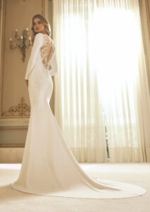 De elegantie van eco-crepe versmelt met een bloemenborduurwerk op de slank vallende trouwjurk. Een minimalistische trouwjurk kun je prachtig combineren met een klassieke sluier.