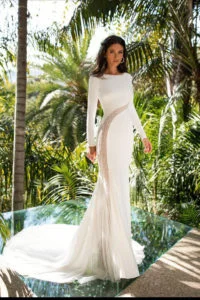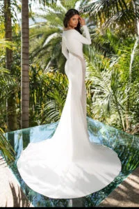 Morgan is geheel van een zware luxe crêpe die prachtig vormt naar het lichaam met een inzet van glinsterende kralen waardoor er een zeemeerminnen patroon gecreëerd wordt. Een trouwjurk die bruist van glamour door het slanke model met strakke mouwen.