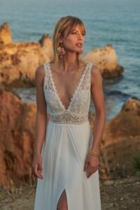 Zeg je boho, dan zeg je Rembo Styling. Piu Bella heeft een zwierige rok met split. De top is afgewerkt met een mooi kartelrandje in de V-hals, wat ook terugkomt op de rug. Het kant op de top doet denken aan waaiers of schelpjes. Deze trouwjurk past dan ook perfect bij een bohemian bruiloft!