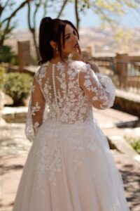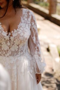 Deze elegante bruidsjurk is ontworpen met luxueuze transparante afneembare mouwen om een andere look te creëren tussen de ceremonie en de receptie.