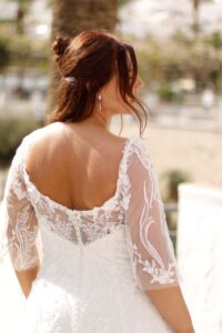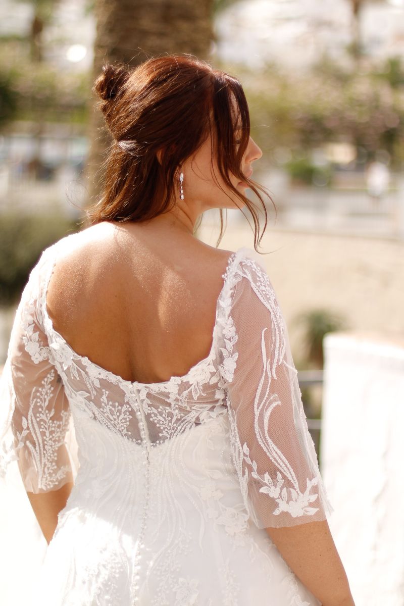 Het lijfje heeft luxueuze en transparante afneembare mouwen wat zorgt voor twee verschillende looks.