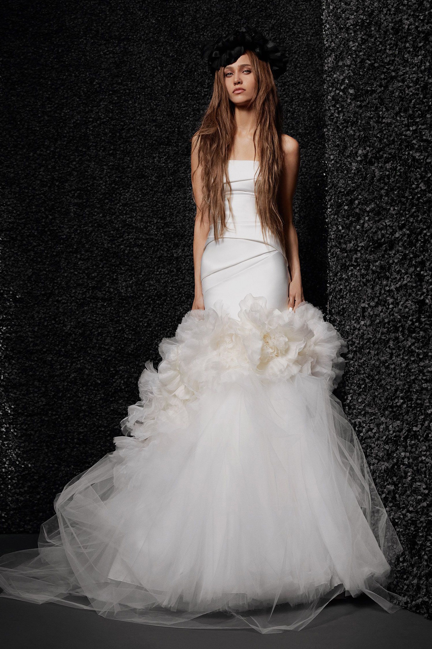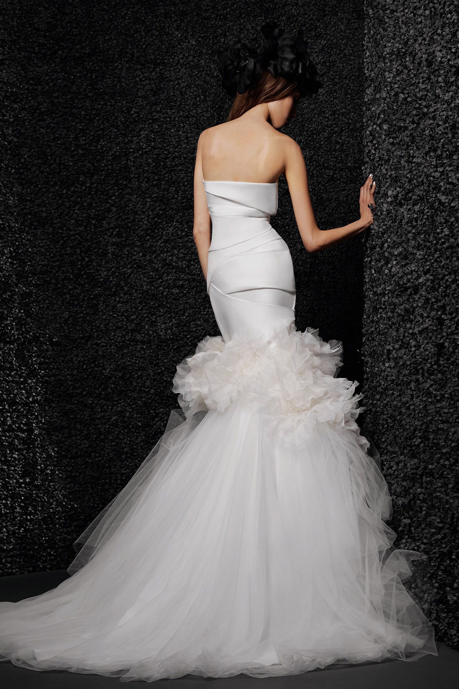 Een fit & flair jurk met een innovatief, gevouwen architectonisch ontwerp in zachte mikado. Met een speelse rok van zachte tule. Een optionele slinger van oversized organza bloemen rond de heupen zorgt voor een prachtig detail.