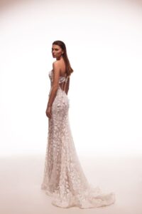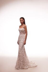 Romantische strapless zeemeermin trouwjurk, volledig bedekt met bloemenkant. De Donuta heeft een rechte decolleté, een glanzend semi-transparant korset met baleinen, afneembare spaghettibandjes versierd met 3D-bloemenapplicaties, een gesloten knoopsluiting aan de achterkant met een verleidelijk uitsnede. Een echte Eye catcher.