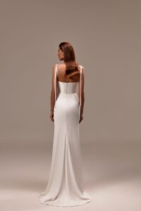 Elegante en chique stakke trouwjurk met spaghettibandjes, gemaakt van rekbaar satijn. Met een vierkante halslijn, spaghettibandjes bezaaid met kristallen die sierlijk naar achteren hangen, een ritssluiting aan de achterkant en een gedurfde hoge split, benadrukt door asymmetrische drapering.